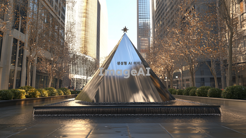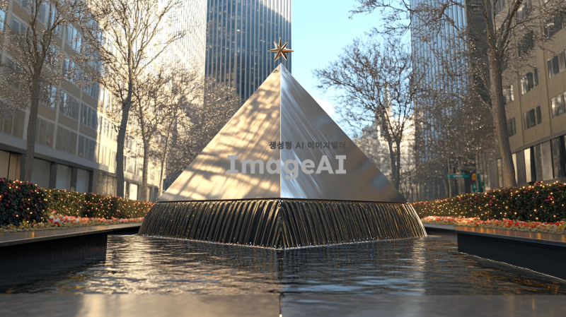 리얼리스틱한 스테인리스로 만든 원뿔 모양의 상징적인 아티팩트, 아티팩트의 꼭대기에 작은 별 모양 장식이 있는 모습, UN 건물 앞에 전시된 모습, 전체 샷, 높이 5미터