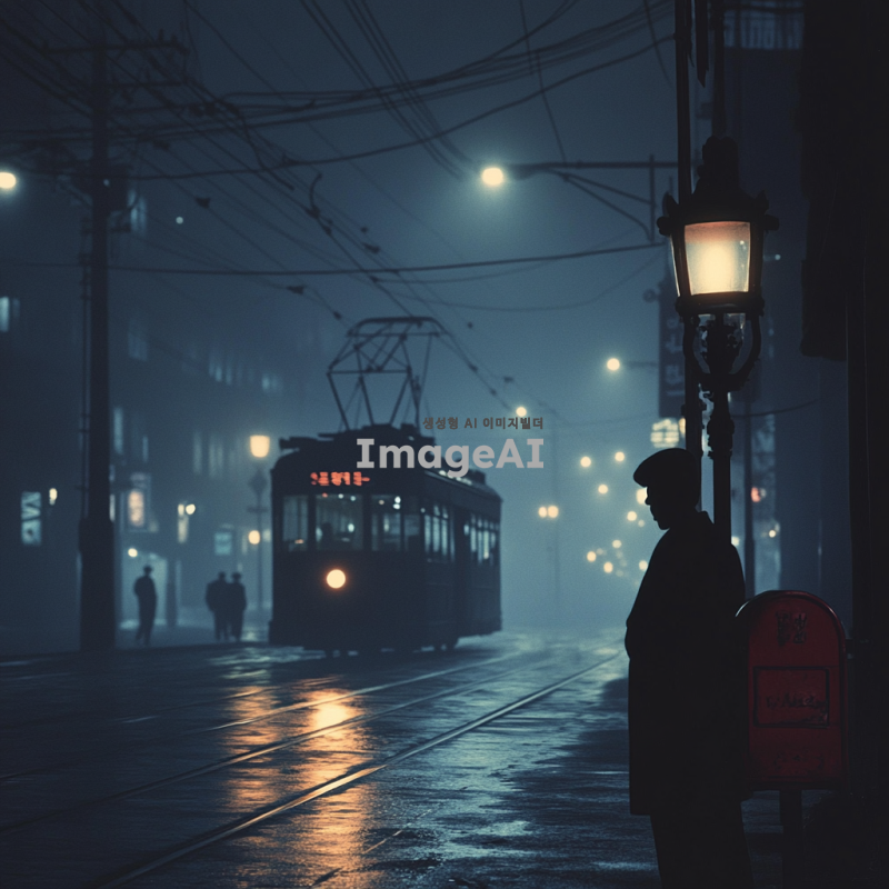 1940년 한국 서울의 도시, 깊은 밤, 짙은 안개에 뿌옇게 보이는 거리와 건물들, 원근법의 소실점처럼 먼 곳에 있는 전차, 오른쪽 하단에는 밝게 빛나는 가로등 하나와 붉은 색의 우체통 하나, 멀리 있는 전차를 바라보는 마른 남자의 뒷모습 전신, 애니메이션 느낌,