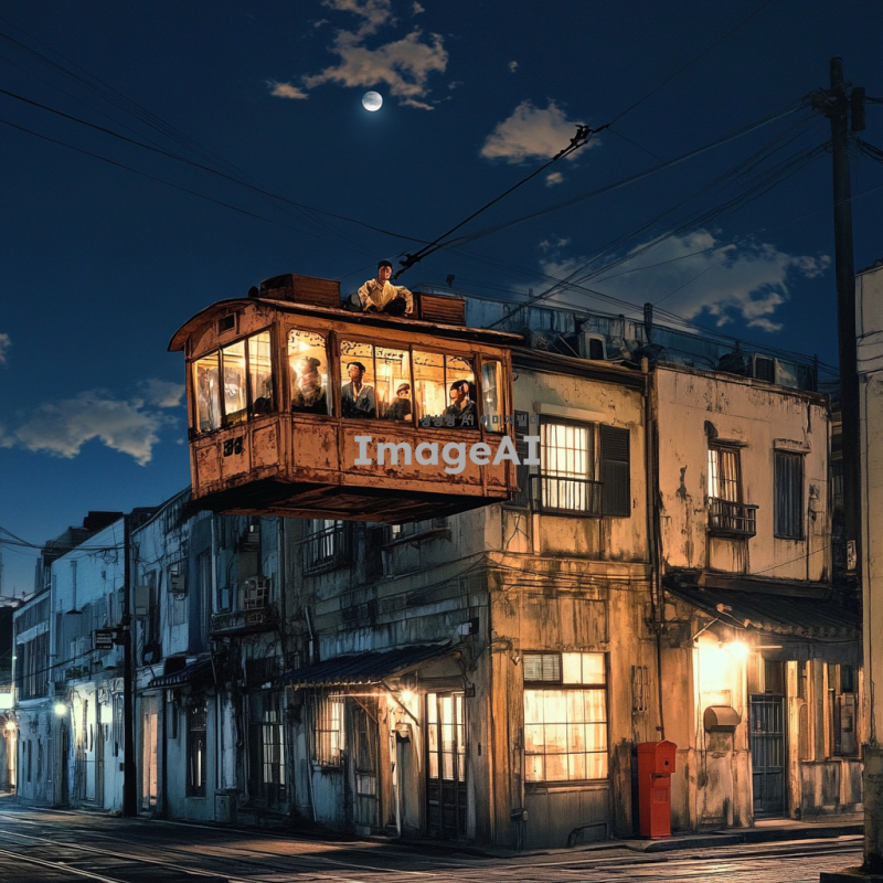 1930년대 한국 도시의 거리, 허름한 가게와 집, 2~3층짜리 낡은 건물들이 늘어선 컴컴한 밤, 하늘 높은 곳에 떠 있는 1930년대식 전차, 전차 안에 있는 한국인들, 땅에는 붉은 우체통, 손에 촛불을 들고 붉은 우체통 위에 앉아 있는 한 명의 한국 남성, 비사실적이고 초현실적인 장면.