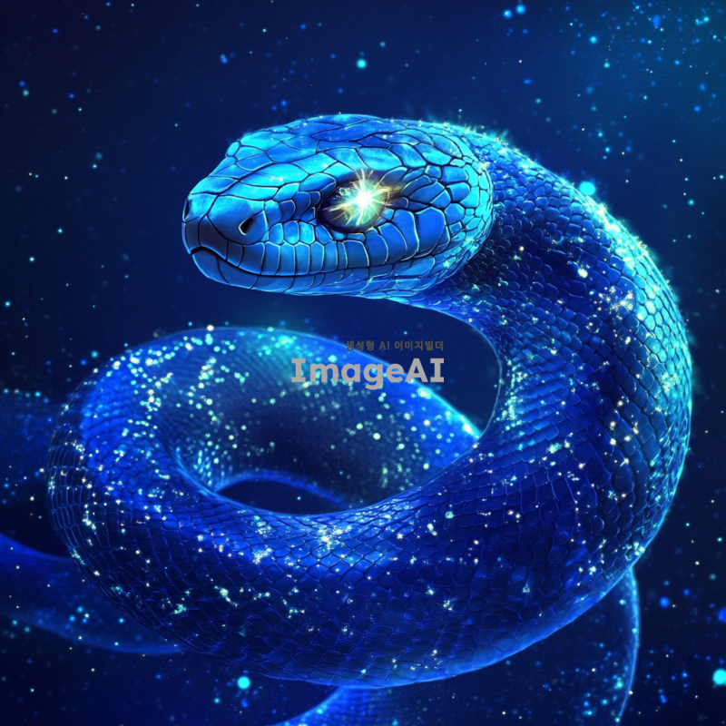 푸른 배경 위에 신비롭게 빛나는 푸른뱀, 뱀의 비늘은 빛을 반사하며 다양한 파란색과 녹색의 오묘한 색조를 띄고 있음, 뱀의 눈은 밝고 매혹적인 빛을 발하며 지혜로운 느낌을 줌, 뱀의 몸은 부드럽게 곡선을 그리며 우아하게 움직이고 있음, 주변에는 작은 별빛들이 반짝이며 환상적인 분위기를 더함, 전체적으로 몽환적이고 신비로운 분위기, 고화질, 세밀한 디테일.