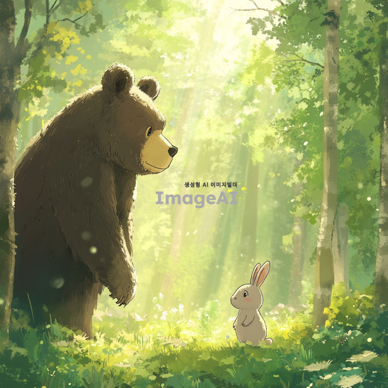숲속의 평화로운 정경 속에서 작은 토끼가 커다란 곰을 똑바로 바라보고 있는 장면. 토끼는 귀엽고 약간 화난 표정을 짓고 있으며, 곰은 놀란 듯한 표정으로 토끼를 내려다보고 있다. 배경은 푸른 나무와 부드러운 햇살이 비치는 초원으로 둘러싸여 있다. 토끼와 곰의 크기 차이가 강조되어 있으며, 전체적인 분위기는 유머러스하다.