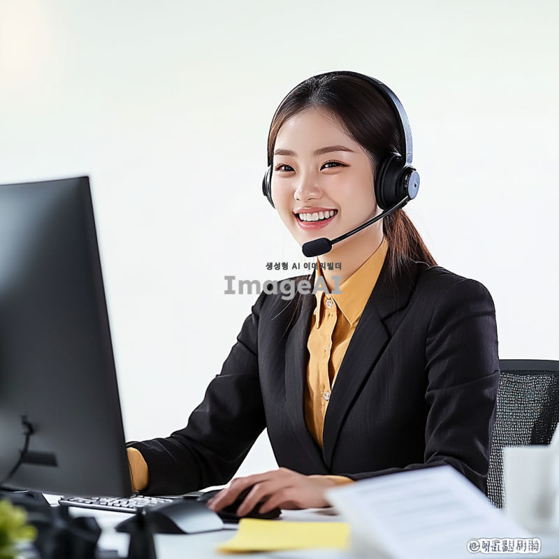 고객센터에서 일하는 한국 여성을 묘사하는 이미지. 그녀는 밝고 친절한 미소를 지으며 헤드셋을 착용하고 있다. 사무실 환경에서 컴퓨터 앞에 앉아 있으며, 깔끔하고 단정한 복장을 하고 있다. 주변에는 고객 응대를 위한 메모와 전화기가 놓여 있다. 그녀의 표정은 전문적이고 신뢰감을 준다.