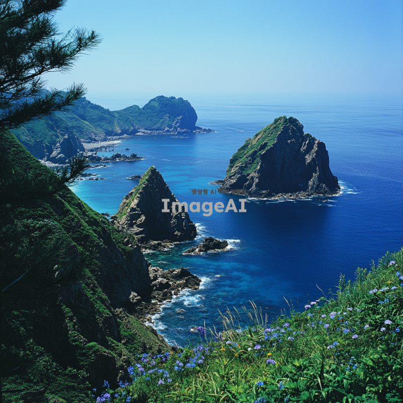 독도의 푸른 바다와 자연의 아름다움을 강조하는 장면, 맑고 푸른 하늘 아래 펼쳐진 독도의 전경, 바다와 어우러진 울창한 초목과 바위들이 조화롭게 어우러진 모습, 바람에 흔들리는 풀과 나무들, 맑은 물결이 부서지는 해안선, 독특한 지형과 자연의 신비로움을 담은 풍경, 자연광이 아름답게 비추는 평화로운 분위기.