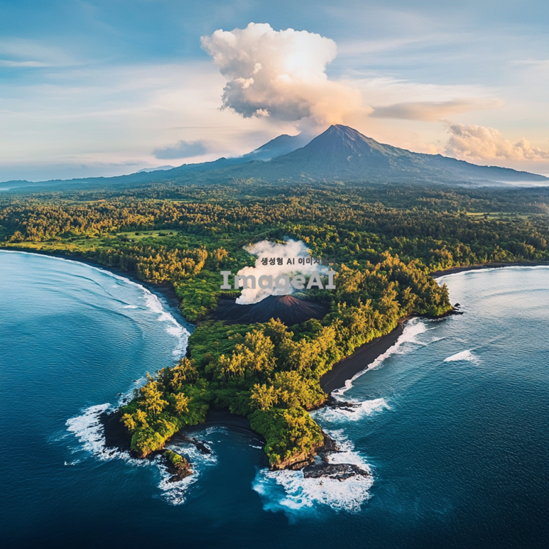 푸른 바다에 둘러싸인 화산섬, 우뚝 솟은 화산과 그 주변을 감싸고 있는 울창한 숲, 하늘을 가로지르는 흰 구름, 섬의 해안선을 따라 펼쳐진 검은 모래 해변, 섬 중앙에 위치한 화산 분화구에서 피어오르는 연기, 장엄한 자연의 아름다움과 고요함을 동시에 느낄 수 있는 풍경, 태양이 지평선 위로 떠오르는 새벽의 부드러운 빛, 바람에 흔들리는 나무와 파도 소리, 자연의 경이로움을 담은 평화로운 분위기.