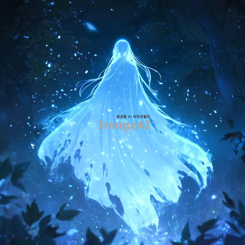 어두운 숲 속에 떠다니는 신비로운 유령 캐릭터, 반투명한 몸체와 부드럽게 흐르는 긴 옷자락, 희미하게 빛나는 푸른빛, 주변에 작은 빛의 입자들이 흩날리는 모습, 고요하고 신비로운 분위기, 달빛이 비치는 배경, 부드러운 바람에 흔들리는 나뭇잎들, 유령의 눈은 깊고 고요한 느낌, 한국 전통 의상을 연상시키는 디자인 요소 포함.