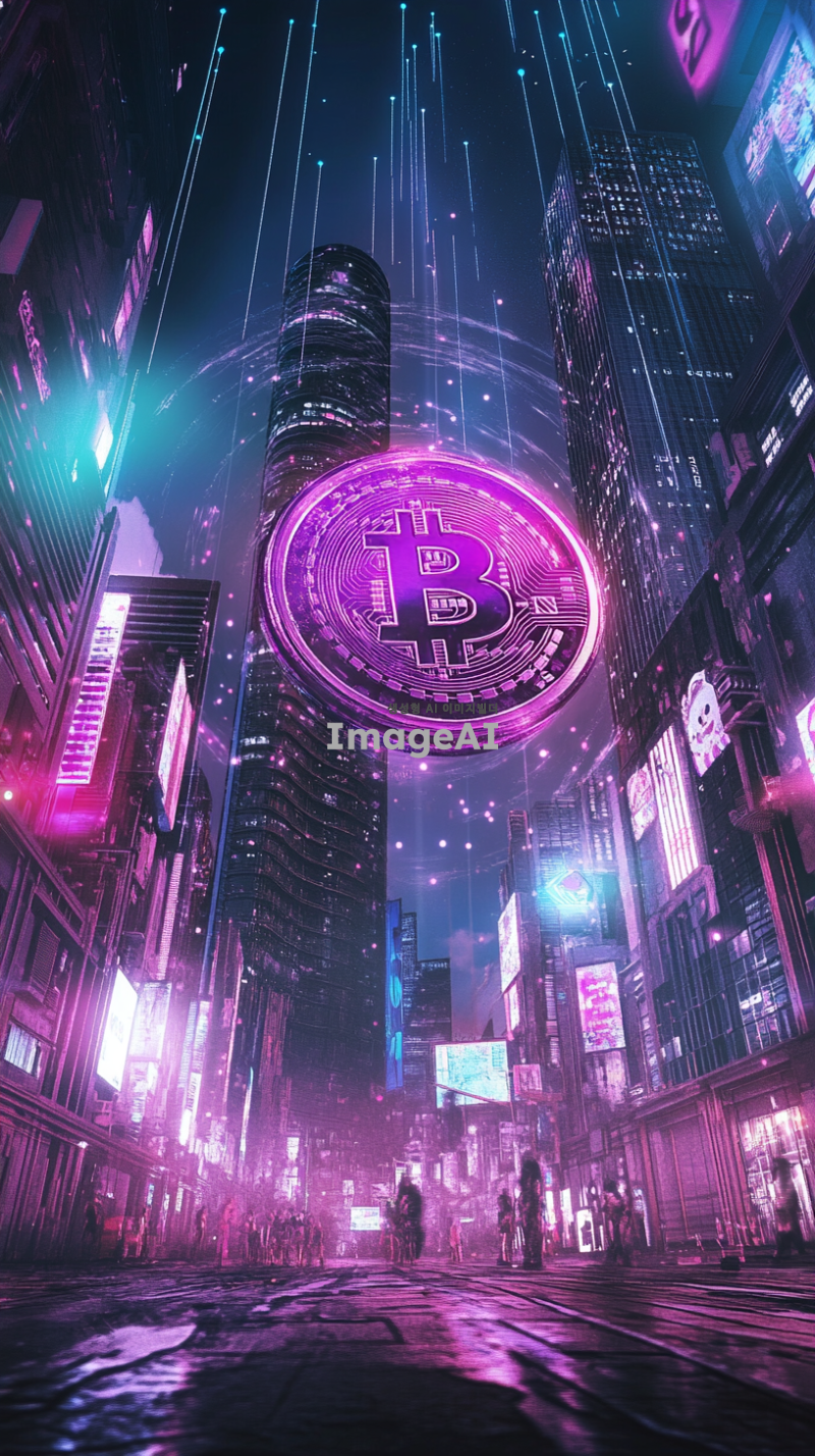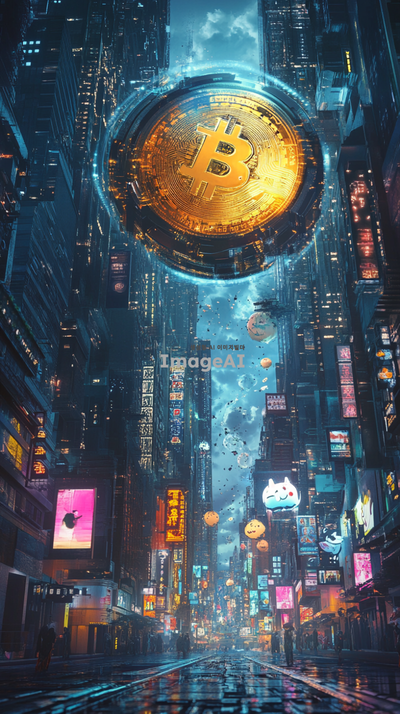 도지코인 로고를 중심으로, 미래 도시의 배경에서 반짝이는 금속 느낌의 거대한 동전이 떠오르는 장면. 동전 주변으로는 디지털 화폐의 흐름을 상징하는 빛나는 선들이 움직이고 있으며, 하늘에는 북극광 같은 화려한 색채의 빛이 퍼져 있다. 도시의 건물들은 첨단 기술을 암시하는 디자인으로, 네온사인과 홀로그램 광고가 곳곳에 보인다.