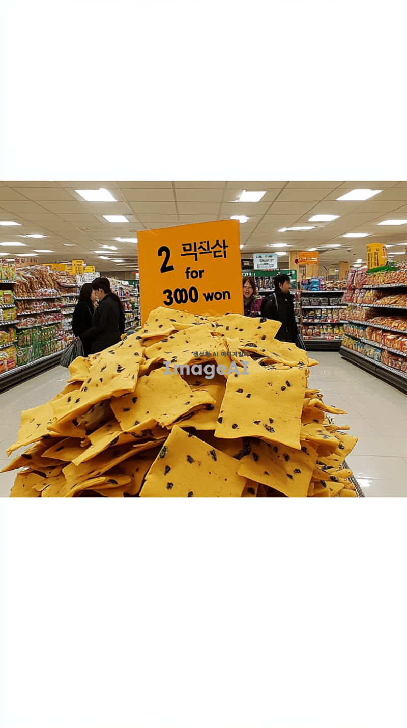 밝고 화사한 슈퍼마켓 내부, 할인 행사 배너가 걸려 있는 모습, 두부과자 패키지가 선반에 진열되어 있는 장면, 두부과자 패키지에 "2개에 3000원"이라는 문구가 선명하게 보이도록 강조, 고객들이 두부과자를 살펴보는 장면, 따뜻하고 친근한 분위기.