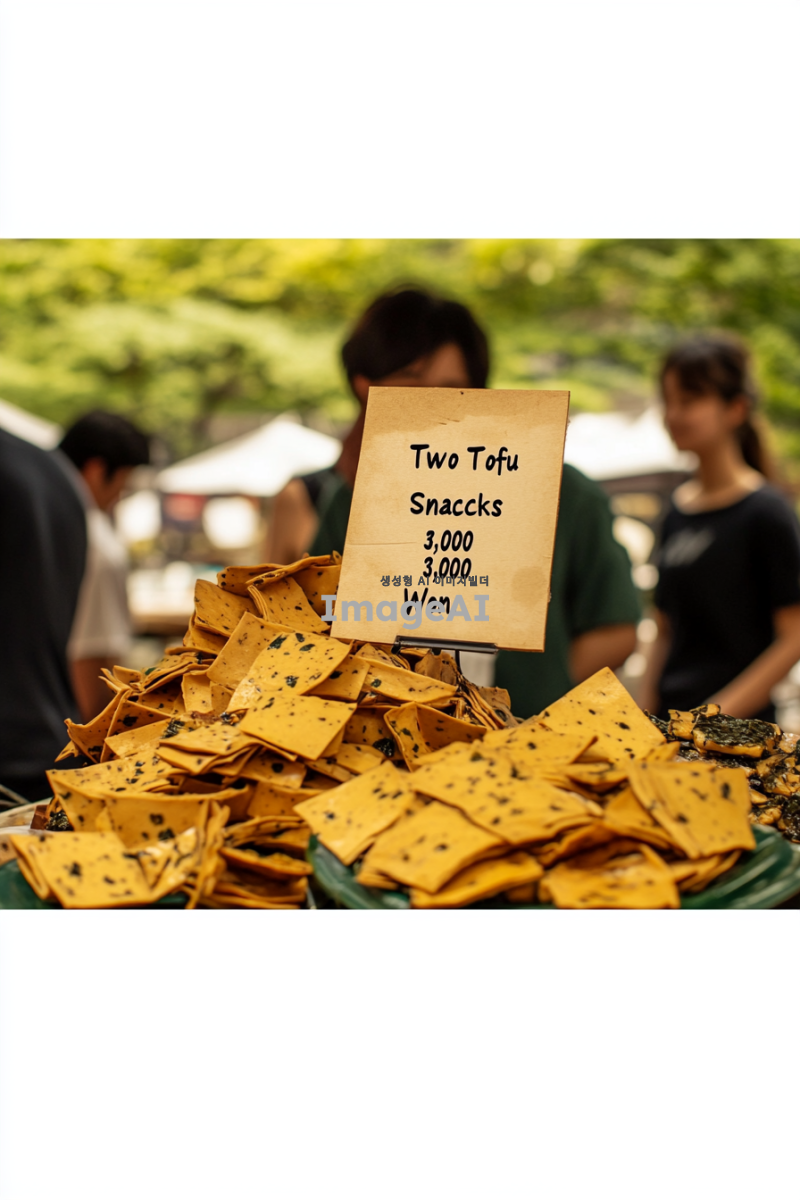 한국 전통 시장의 두부과자 판매 부스, 두부과자 2개 3000원 할인 행사 중. 부스 주변에 사람들이 북적이고, 다양한 두부과자가 진열되어 있는 모습. 판매자는 친절한 미소를 짓고 있으며, 두부과자의 고소한 냄새가 풍기는 듯한 분위기. 행사 광고판에 "두부과자 2개 3000원"이라고 적혀 있음. 한국의 전통적인 시장 풍경과 함께 따뜻하고 활기찬 느낌.