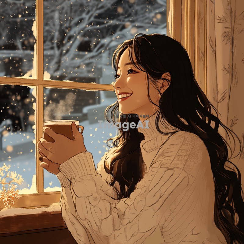 눈 오는 밤, 창가에 앉아 있는 30대 한국 여성, 따뜻한 코코아를 손에 들고 행복하게 미소 짓고 있음, 창 밖으로 보이는 눈 내리는 풍경, 따뜻하고 아늑한 실내 분위기, 부드러운 조명, 여성의 긴 머리는 자연스럽게 흘러내림, 편안한 니트 스웨터를 입고 있음, 감성적이고 따뜻한 색감의 일러스트, 디테일한 눈송이와 창문에 맺힌 서리가 강조된 배경