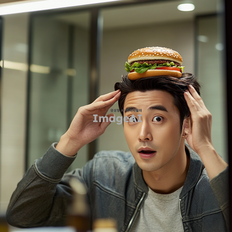 한국 남성이 거울을 보며 자신의 머리를 만지고 있는 장면, 머리 위에는 실제로 햄버거가 올려져 있는 모습, 햄버거의 디테일이 살아있고 맛있어 보이는 모습, 남성은 놀라면서도 웃고 있는 표정, 실내 배경, 현대적인 욕실 분위기.