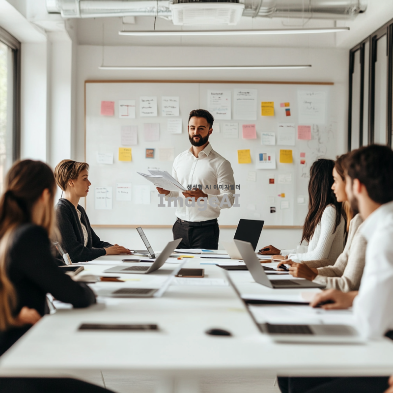 화이트톤의 깔끔하고 단순하며 정돈된 현대적인 회사 회의실 배경, 주변에 아크릴 보드에 무언가 잔뜩 적혀있음. 하얀색 회의 테이블을 가운데 두고 깔끔한 복장을 한 7명의 직장인들이 앉아있고, 한 남성이 테이블 앞에서 한 손에는 종이서류를 쥐고 열정적으로 설명하며 회의 중. 테이블에는 각자의 노트북과 마우스, 회의를 위한 서류가 올려져 있음. 밝고 명랑하며 창의적이고 혁신적인 분위기, 전문성과 열정을 나타내는 표정.