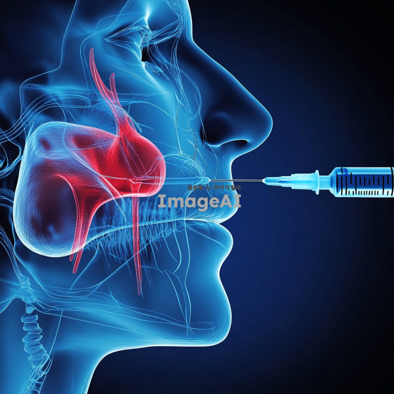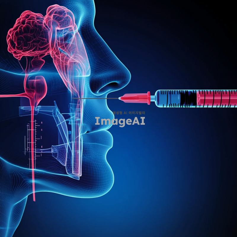 파란색 톤의 배경, 측면에서 본 커다란 주사기, 이비인후과 해부도가 포함된 이미지, 비강 부분에 빨간색으로 강조 표시.