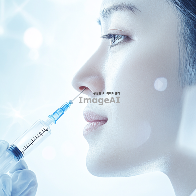 한국인의 얼굴에 비강에 주사기가 맞대어 있는 장면, 차분하고 세련된 분위기, 파란색과 흰색의 배경, 전문적이고 깔끔한 느낌, 의료기기 브로셔에 적합한 이미지.