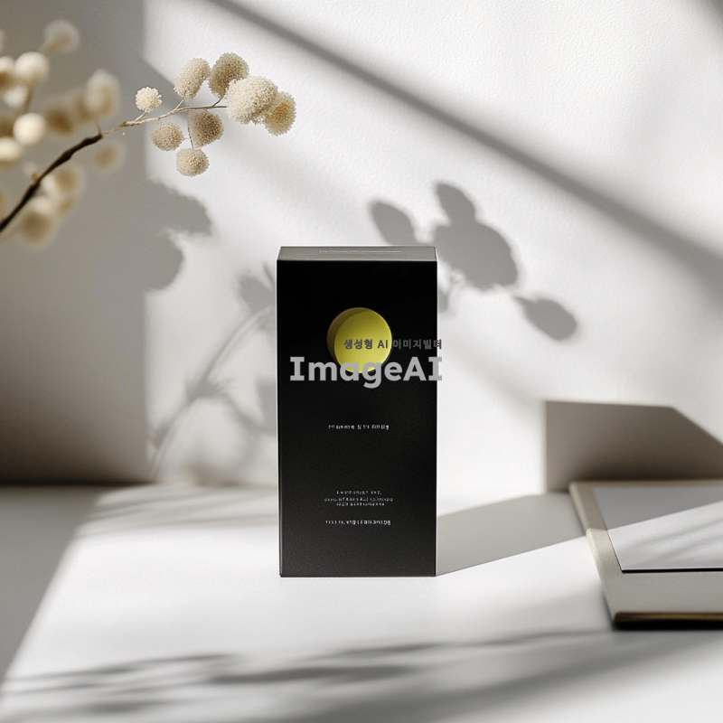검은색 직사각형 향수 패키지 박스, 중앙에 작은 초록색 원이 뚫린 디자인, 깔끔하고 현대적인 스타일, 고급스러운 느낌, 심플한 색상 조합, 미니멀한 디자인 요소, 부드러운 그림자 효과, 자연광 아래 흰 책상 위에 놓인 모습, 한국인 디자이너의 세련된 감각 반영.