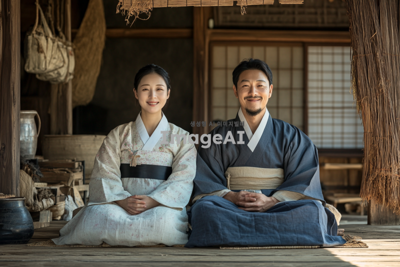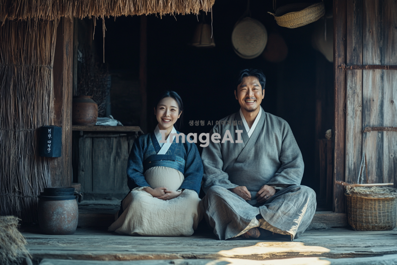 조선시대 배경, 초갓집 마루에 앉아있는 평민 부부, 여자는 임신하여 배가 불룩한 상태, 남자는 행복한 표정, 부부는 매우 가난한 모습, 전통적인 한복을 입고 있으며 주변 환경은 소박하고 단순한 느낌, 따뜻하고 평화로운 분위기.