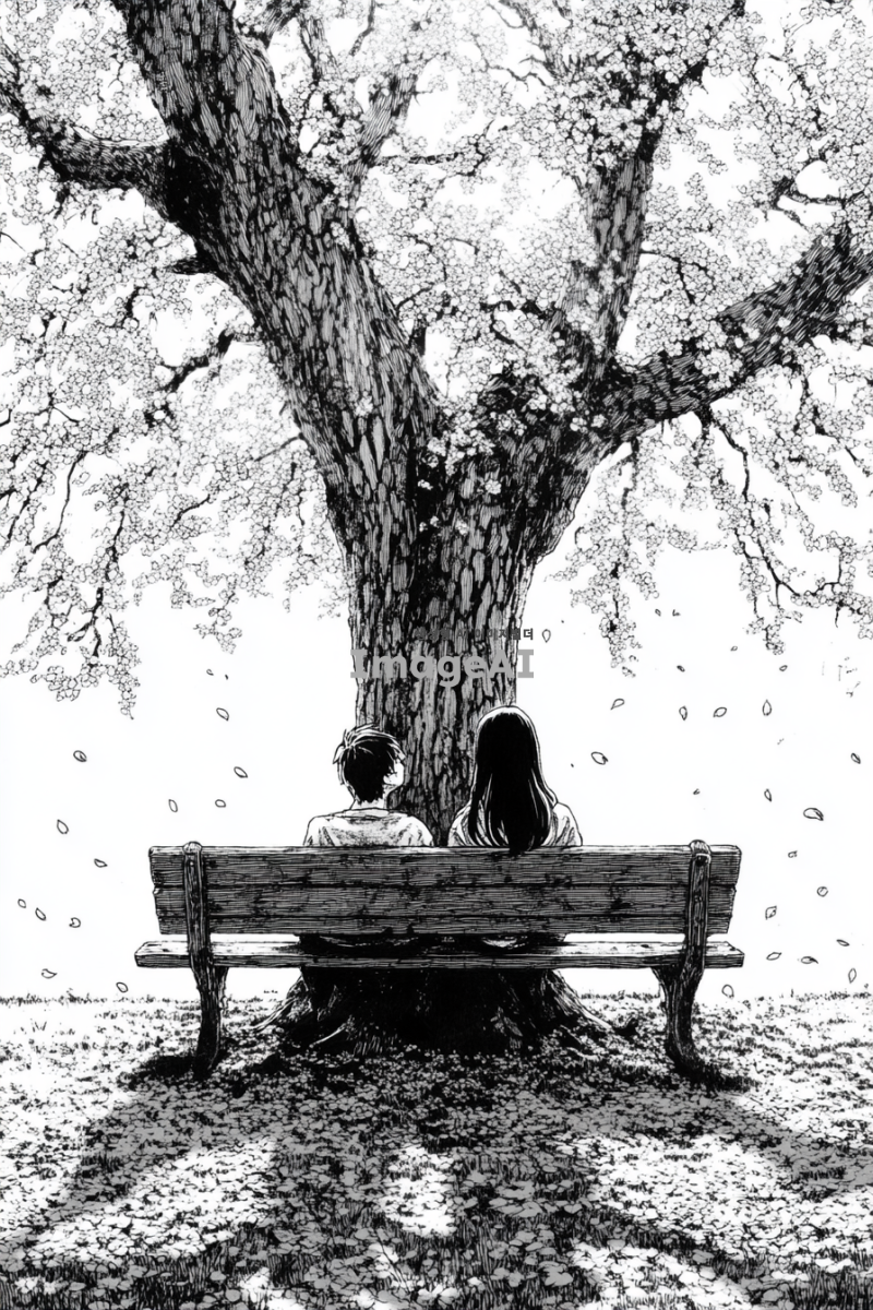 연인과 함께 벤치에 앉아 서로를 바라보며 미소 짓는 모습, 주변에는 벚꽃이 흩날리는 장면, 따뜻한 봄날의 분위기, 선으로만 표현된 섬세한 디테일, 연인의 얼굴에 행복한 감정이 드러나는 표정, 자연스럽고 편안한 자세, 사랑스러운 분위기.