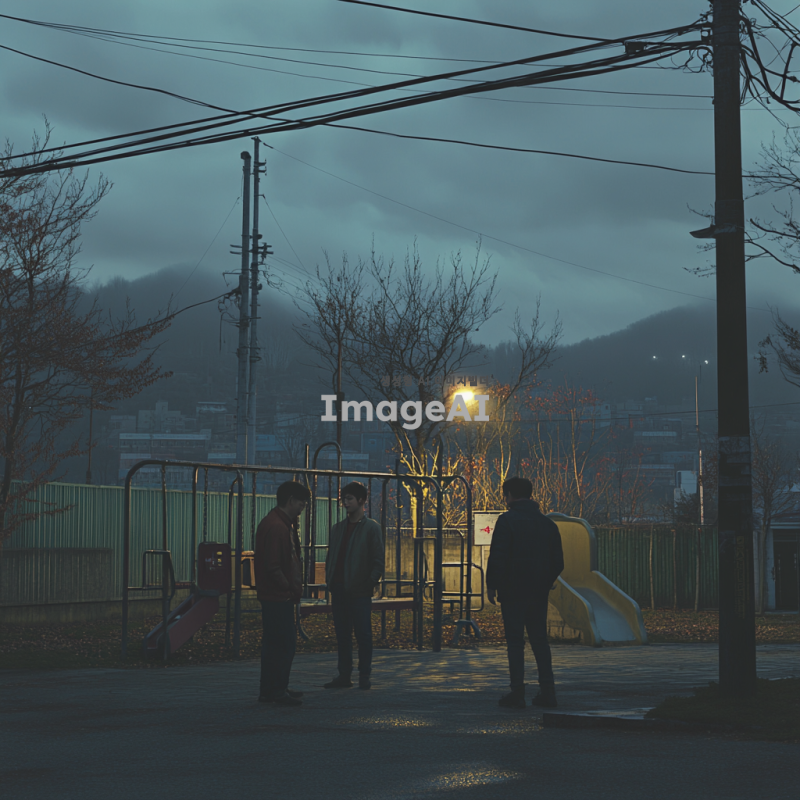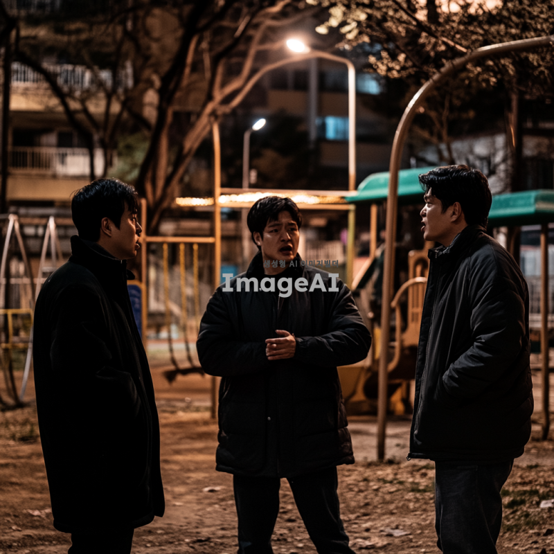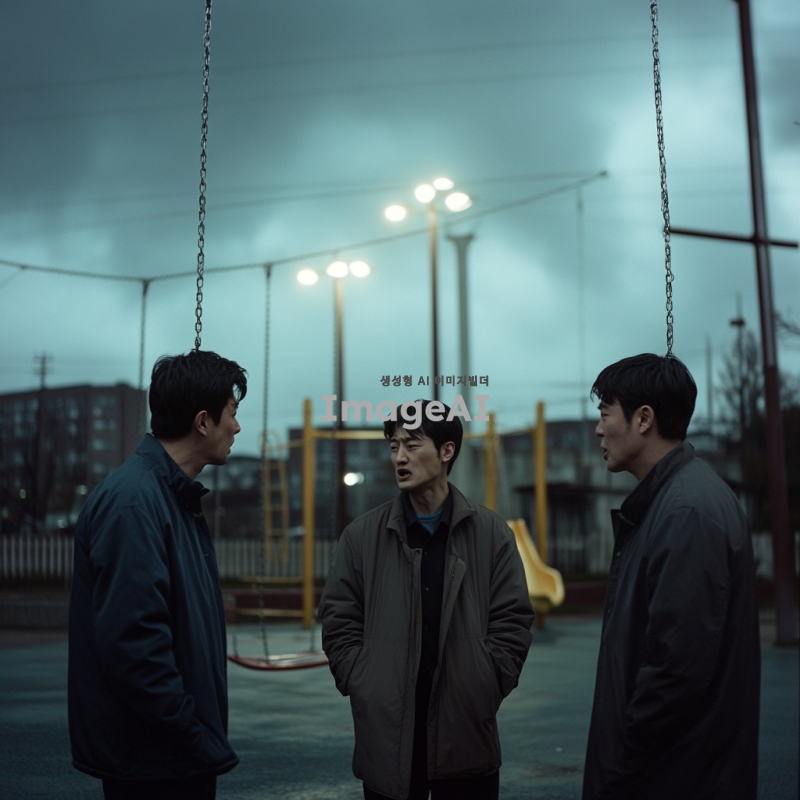 어두운 저녁, 고요한 분위기의 한적한 놀이터, 세 명의 한국인 남자들이 격렬하게 다투고 있는 장면. 놀이터는 약간 오래된 느낌으로, 주변에 낡은 그네와 미끄럼틀이 보인다. 남자들은 감정이 격해진 표정으로 서로를 향해 서 있으며, 그들 주위로는 희미한 가로등 불빛이 비치고 있다. 분위기는 긴장감이 감돌며, 배경에는 어둡고 흐린 하늘이 펼쳐져 있다.