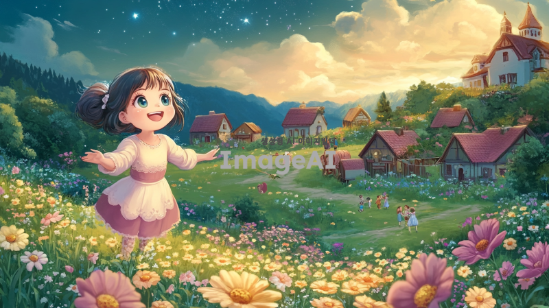 조용하고 아름다운 작은 마을의 풍경, 파스텔 톤으로 표현된 평화로운 분위기. 초록 들판에서 뛰어노는 아이들, 서로 도우며 웃음 짓는 마을 사람들. 마을 중심에 서 있는 소녀 리나, 꿈을 꾸는 듯한 표정으로 별을 바라보는 모습. 하늘을 나는 모험과 깊은 바다 탐험을 상상하는 리나의 모습이 함께 어우러진 귀여운 동화 같은 장면.