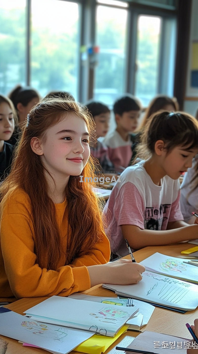 일반 교실 환경, 지적장애 학생과 일반 학생들이 함께 협력하여 공부하고 있고, 학생들은 서로 도와주며 웃고 있고, 창문으로 햇빛이 들어와 밝은 분위기를 연출, 교사는 학생들 곁에서 지원하고 있는 모습, 모두가 협력하고 존중하는 분위기