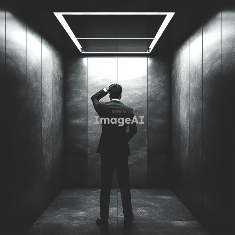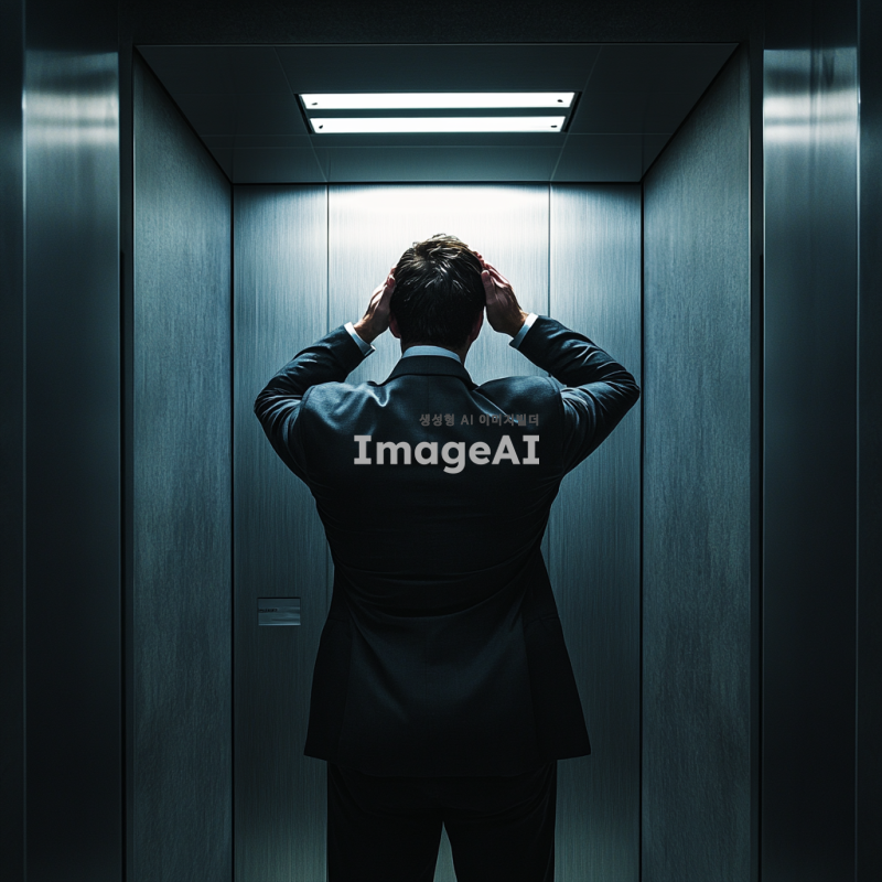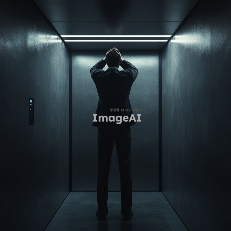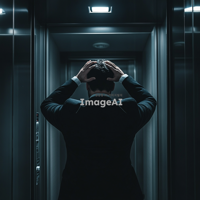 회사 엘리베이터 내부, 한 남자가 뒷모습으로 서 있음, 남자는 정장을 입고 있으며 머리를 손으로 감싸고 있음, 어지러워 보이는 자세, 엘리베이터 내부는 현대적이고 깔끔한 디자인, 어둡고 현실적인 분위기, 남자의 자세와 분위기에서 피로감과 혼란스러움이 느껴짐.