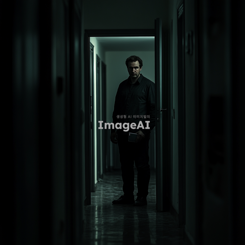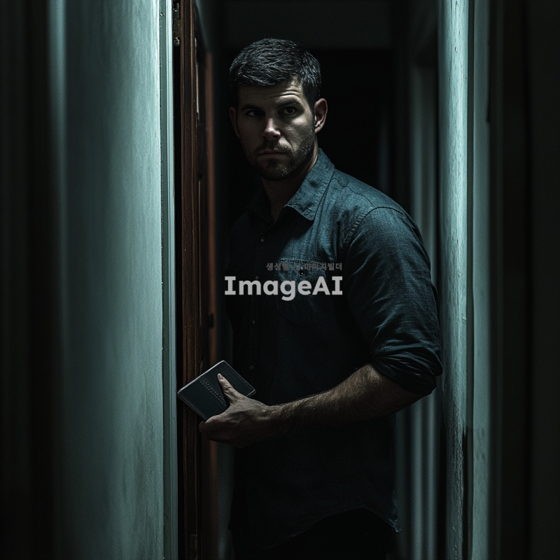 어두운 복도에 서서 살짝 열린 문 안쪽을 조심스럽게 들여다보는 남자의 뒷모습, 남자는 한 손에 지갑을 들고 있으며, 긴장감 있는 분위기가 감도는 장면, 전체적인 색조는 어둡고 미묘한 긴장감을 강조.