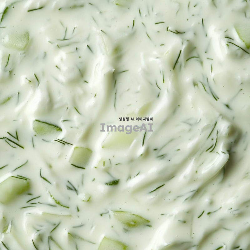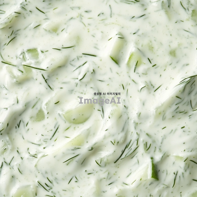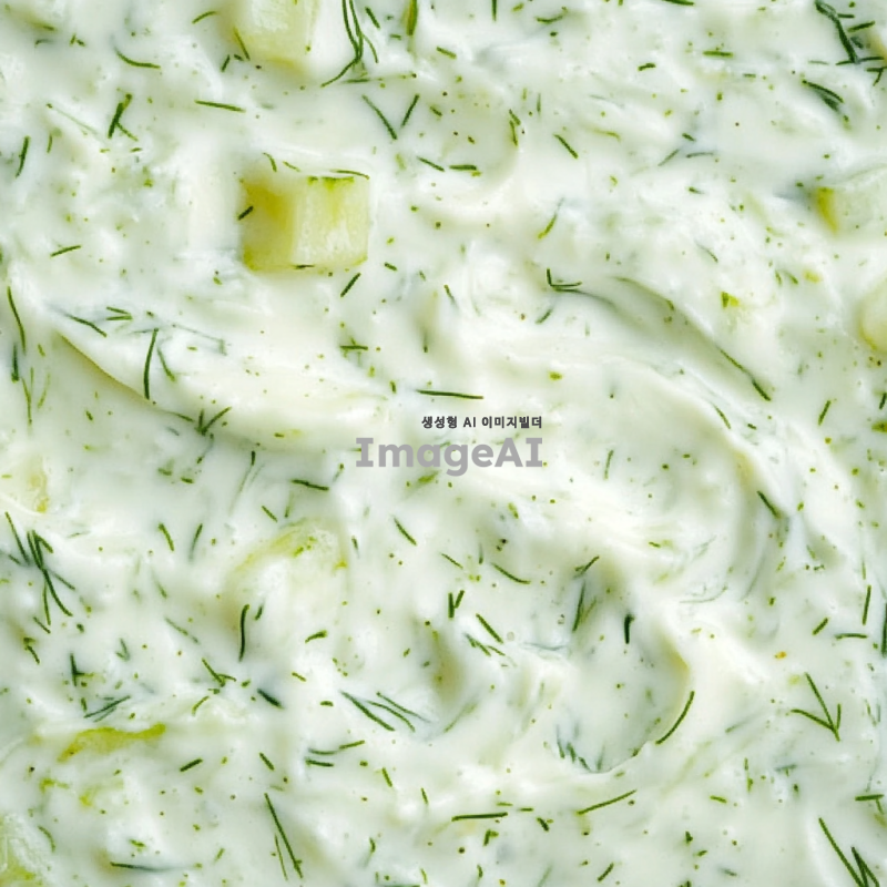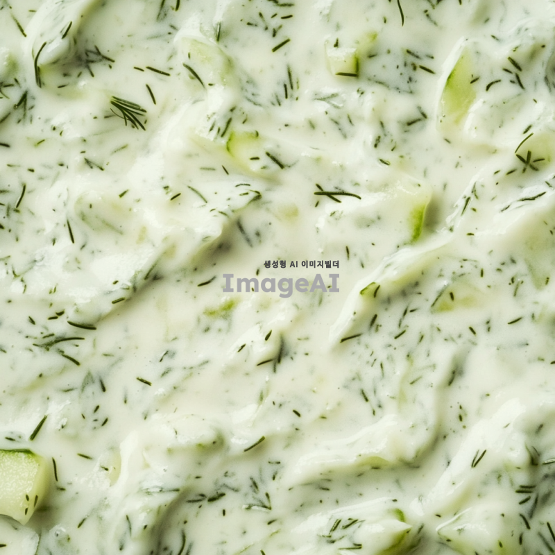 - 흰색 배경에 사워크림과 딜이 있는 짜지키, 사워크림과 오이 드레싱 또는 액체 오이 소스로도 알려져 있는 짜지키의 클로즈업. 텍스처는 크림 같고 연한 녹색이며, 소스 안에 작은 오이 조각이 보입니다. 전통적인 그리스 소스로 달콤하면서도 꽃향기가 나는 특징이 있습니다. 각도는 크리미하고 톡 쏘는 텍스처와 식물 요소의 상쾌한 조화를 전체적으로 보여줍니다.