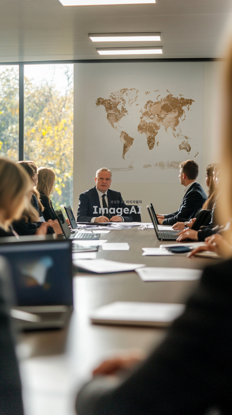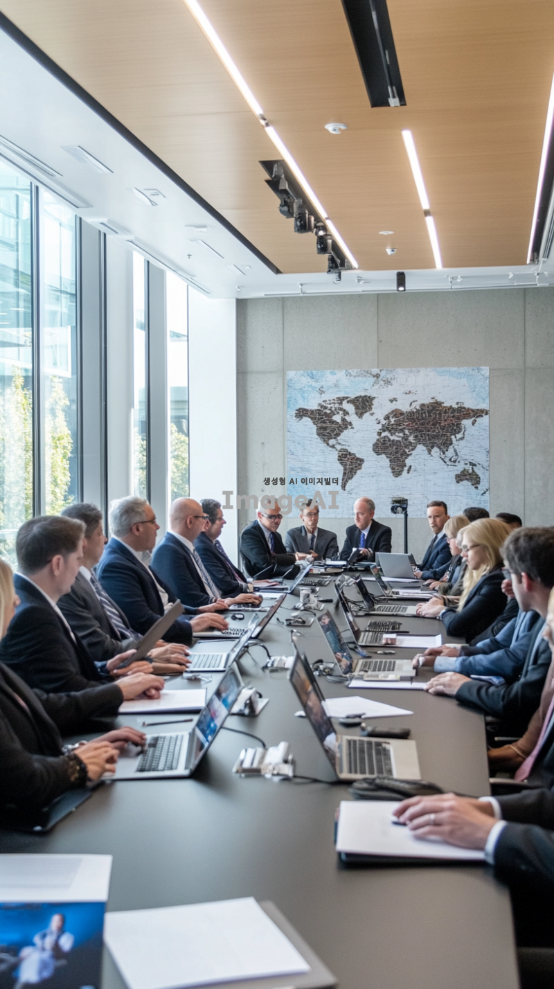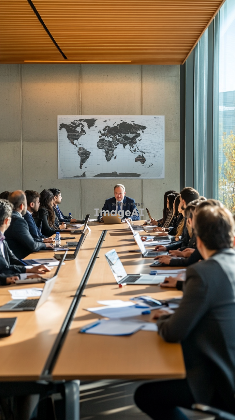 현대적인 회의실에서 국무총리가 회의를 주재하는 모습, 긴 테이블을 중심으로 다양한 연령대의 사람들이 앉아 있으며 노트북과 서류가 놓여 있음, 국무총리는 정장 차림으로 중앙에 앉아 있으며 진지한 표정으로 회의 진행, 회의실 벽에는 세계 지도가 걸려 있고 창문을 통해 자연광이 들어옴, 참석자들은 집중하여 국무총리의 말을 경청하고 있음, 현대적이고 깔끔한 인테리어, 전체적으로 프로페셔널하고 차분한 분위기.