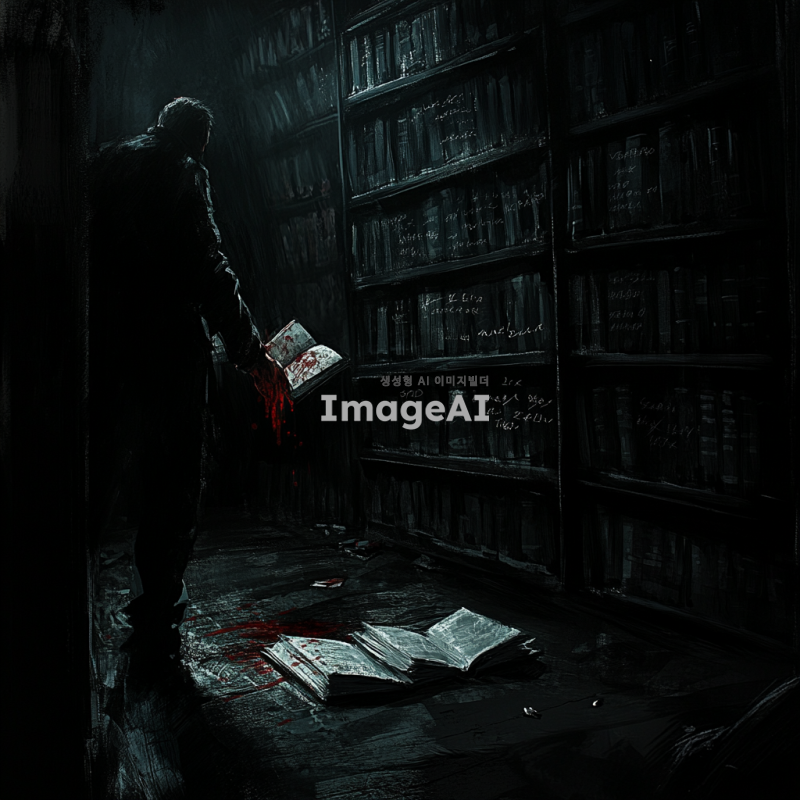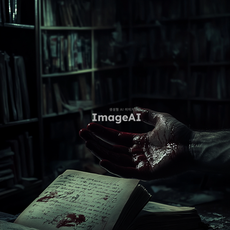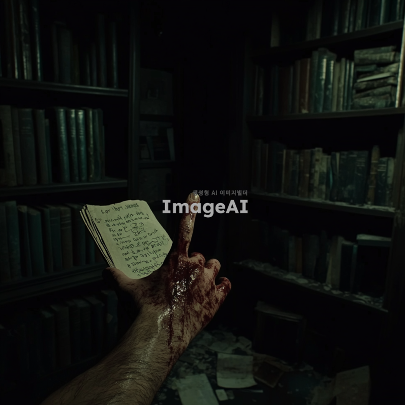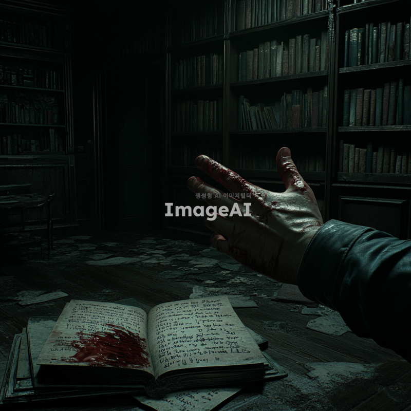 어두운 방 안, 남자의 시점에서 본 손에 빨간 액체가 묻어있는 모습. 바닥에는 찢겨진 책이 놓여 있고, 책장마다 낙서와 이상한 글귀가 가득하다. 주변은 칠흙같이 어두워 음산한 분위기를 자아낸다.