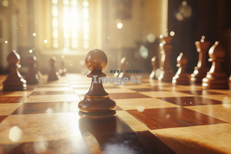 체스판 위에 위치한 폰이 체스판의 끝에 도달한 장면, 폰은 승리의 순간을 상징하며 빛나는 오라에 둘러싸여 있음. 체스판은 고급스러운 나무 재질로, 주변에는 다른 체스 말들이 정렬되어 있으며, 배경은 약간 흐릿하게 처리되어 폰에 집중되도록 연출됨. 조명은 부드럽고 따뜻한 색조로 폰을 강조하며, 전체적인 분위기는 전략적이고 지적인 느낌을 줌.