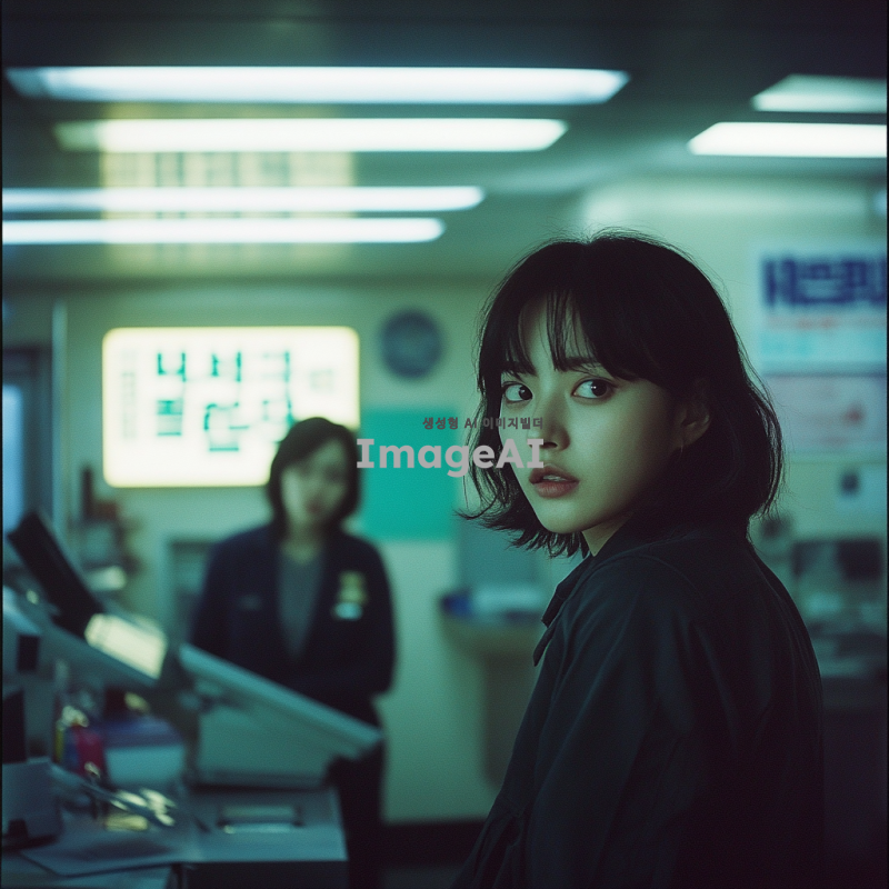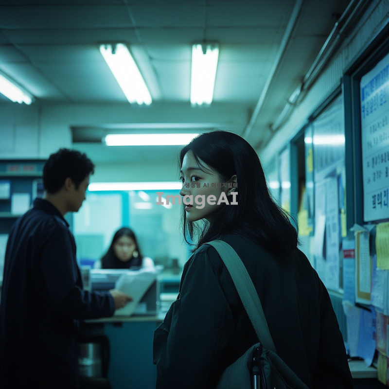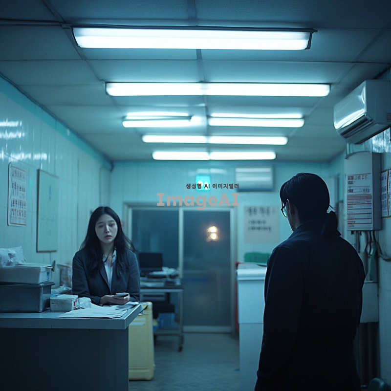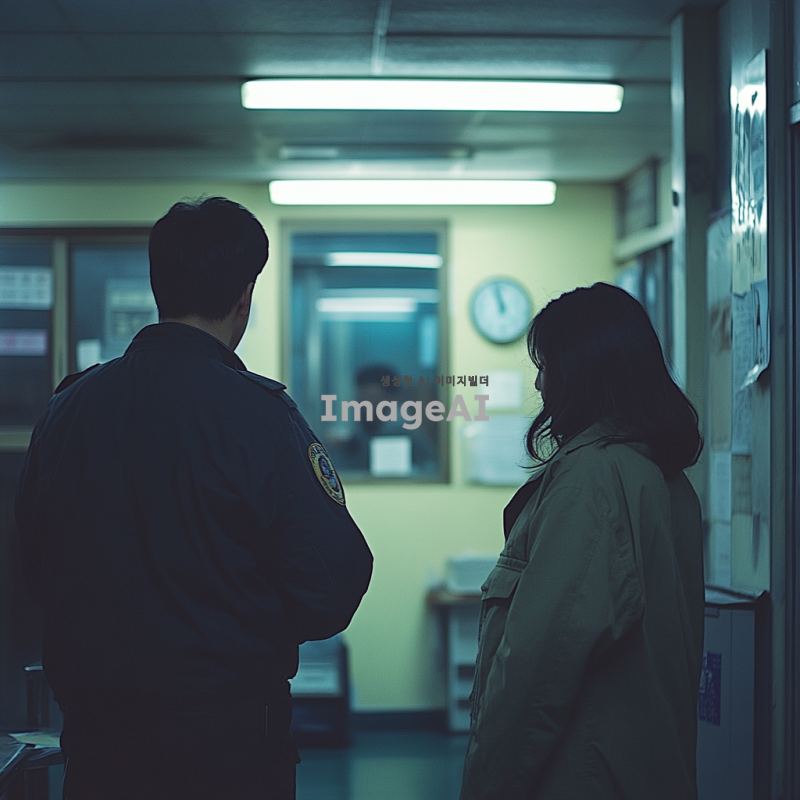 한국 경찰서 내부, 조사받고 있는 남성의 뒷모습, 불안해하며 비협조적인 표정의 여성, 무거운 분위기, 한국 경찰서의 인테리어, 형광등 조명, 긴장감 있는 분위기.