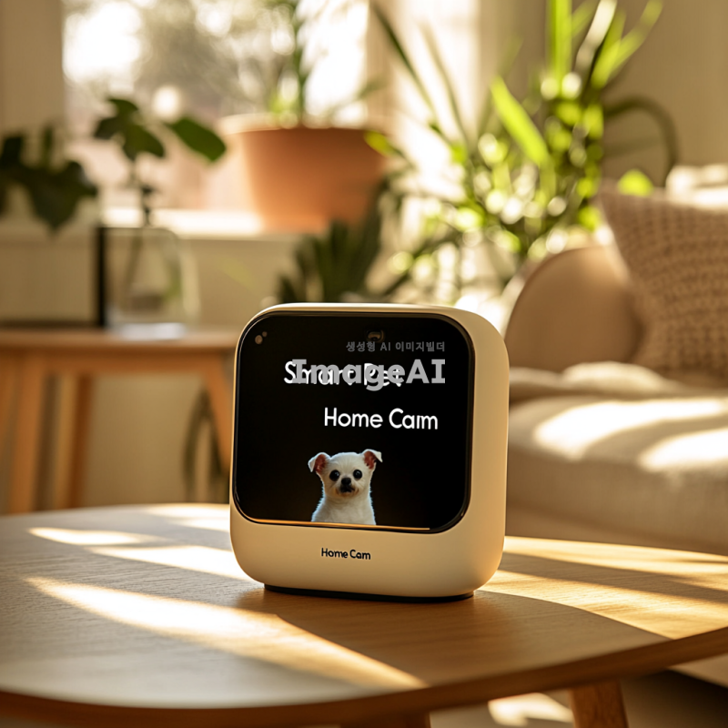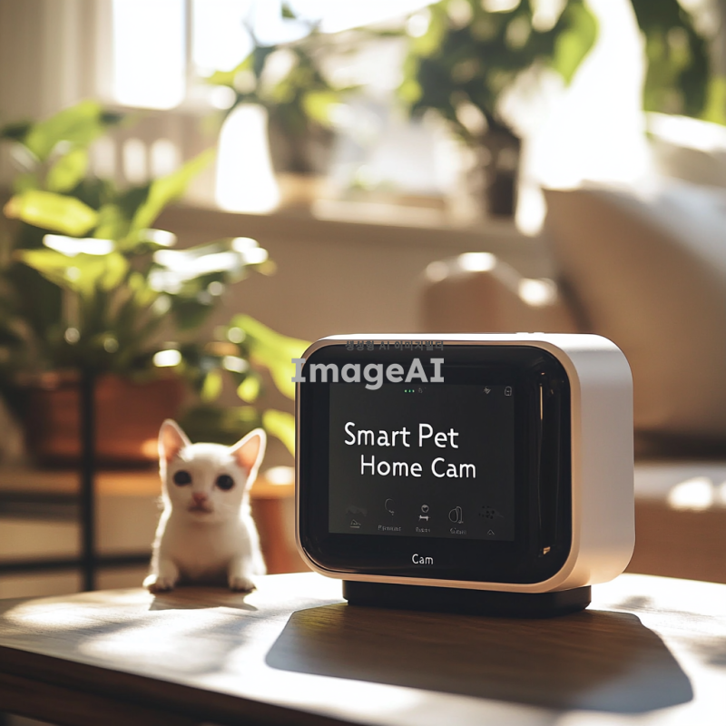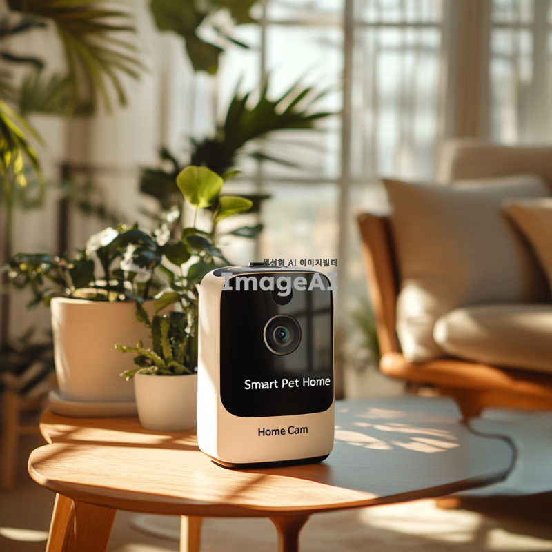 밝고 현대적인 거실에 놓인 세련된 디자인의 반려동물 홈캠, 카메라 렌즈가 돋보이며, 화면에 "스마트 반려동물 홈캠"이라는 글씨가 깔끔한 폰트로 적혀 있는 모습, 주변에는 깔끔하게 정돈된 가구와 식물이 배치되어 아늑한 분위기를 연출하고, 햇살이 창문을 통해 부드럽게 들어오는 장면.