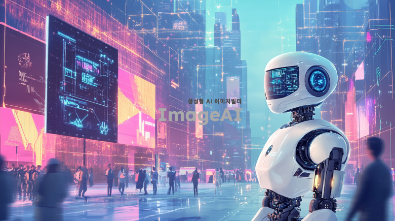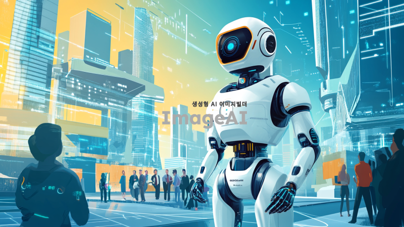 미래 도시의 배경에 서 있는 AI 로봇, 로봇은 친근한 외형으로 설계되어 있으며, 사람들과 상호작용하는 모습. 주변에는 다양한 기술 장치들이 배치되어 있고, 사람들이 로봇의 도움을 받으며 일상생활을 하는 장면. 첨단 기술과 인간의 조화로운 공존을 강조하는 분위기. 밝고 희망적인 색감.
