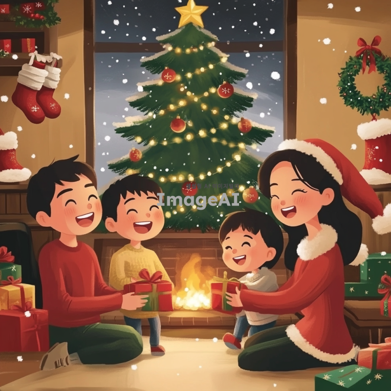 크리스마스 테마의 카툰 이미지, 한국인 가족이 크리스마스 트리 옆에서 선물을 교환하며 환하게 웃고 있는 장면, 아늑한 거실 배경, 벽난로에 걸린 크리스마스 양말, 눈이 내리는 창밖 풍경, 따뜻하고 밝은 색감, 가족 모두 산타 모자 착용, 트리에는 반짝이는 장식과 별이 달려있음, 즐겁고 행복한 분위기.