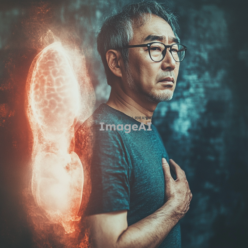 어두운 배경에 피로하고 지친 표정을 짓고 있는 중년 한국인 남성, 눈 밑에 다크서클이 짙고 피부가 창백한 모습, 오른손으로 오른쪽 옆구리를 가볍게 잡고 있는 자세, 배경에는 흐릿하게 간 모양의 그래픽이 겹쳐져 있는 이미지, 건강 문제를 암시하는 차분한 톤의 색감.