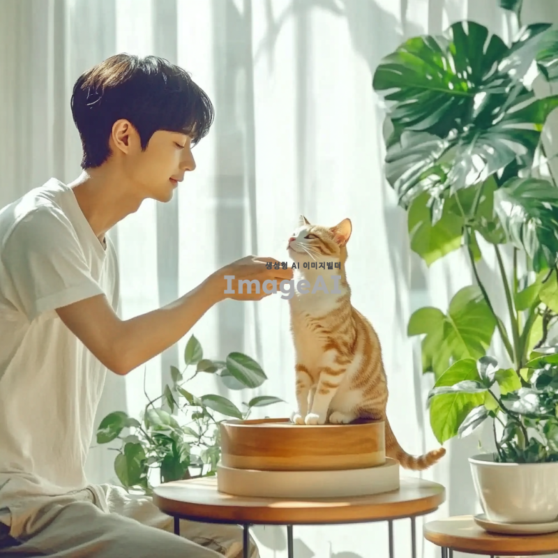 한국인 남성이 나무로 된 작은 탁자 위에 앉아 있는 고양이를 부드럽게 긁어주는 모습. 남성은 편안한 표정으로 고양이를 바라보고 있으며, 고양이는 만족스러운 표정으로 눈을 반쯤 감고 있다. 따뜻한 햇살이 창문을 통해 들어와 방 안을 밝게 비추고 있으며, 주변에는 식물이 놓여 있어 자연스러운 분위기를 연출하고 있다. 방은 아늑하고 평화로운 느낌을 주는 인테리어로 꾸며져 있다.