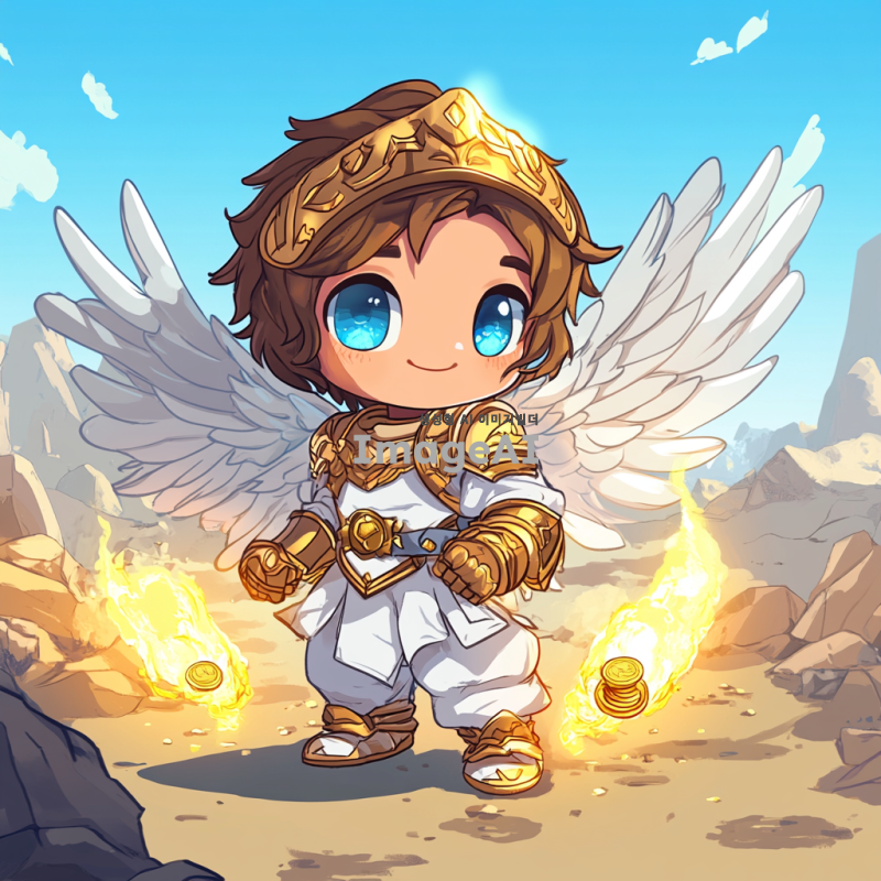 귀여운 하얀 옷을 입은 천사, 갈색 머리와 파란 눈을 가지고 있으며, 금색 헬멧과 날개를 착용하고 있다. 배경은 픽셀 아트 스타일의 사막 모래이다. 발 아래에는 두 개의 작은 빛나는 불꽃이 있으며, 웃고 있는 치비 얼굴을 가지고 있다. 이는 게임 캐릭터 아바타 프로필 사진으로, 단순한 디자인이다. 천사 앞에는 금화를 들고 있는 의인화된 소년이 서 있다. 매우 상세하며, 높은 해상도와 선명한 가장자리를 가지고 있다. 그림자나 그라데이션 색상은 없어야 한다.