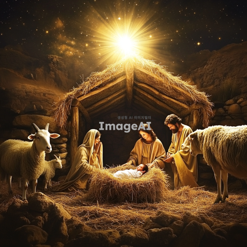따뜻한 황금빛으로 물든 조용한 밤, 별이 빛나는 하늘 아래 평화로운 마구간 안, 구유에 누워 있는 아기 예수님, 주변에는 사랑스러운 미소를 짓고 있는 마리아와 요셉, 그리고 양과 소 같은 동물들이 함께 있는 장면. 배경에는 먼 곳에서 빛나는 크고 밝은 별, 아기 예수님을 비추는 부드러운 빛, 고요하고 경건한 분위기.