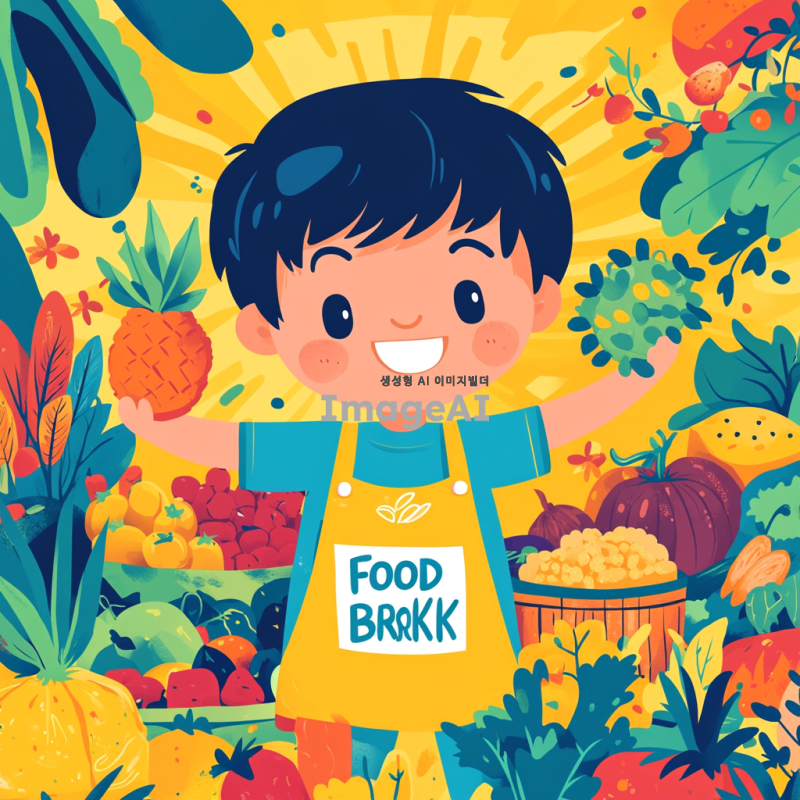 푸드뱅크를 상징하는 친근하고 귀여운 캐릭터, 밝은 미소를 지으며 다양한 음식을 들고 있는 모습, 푸드뱅크의 로고가 새겨진 앞치마를 입고 있으며, 주변에는 신선한 과일과 채소, 곡물이 가득한 장면, 따뜻하고 환영하는 분위기의 배경, 캐릭터는 건강하고 활기찬 느낌, 다양한 연령층에게 호감을 줄 수 있는 친근한 디자인.