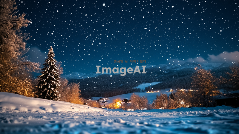 밤하늘을 배경으로 부드럽게 내리는 눈송이들, 반짝이는 별들이 가득한 하늘, 조용하고 평화로운 겨울밤의 분위기, 차가운 공기와 함께 서서히 쌓이는 눈, 어두운 하늘과 하얀 눈의 대비, 자연스럽고 몽환적인 느낌 그리고 셀카 찍을만한 배경으로 그려주고 캐릭터는 없어야해