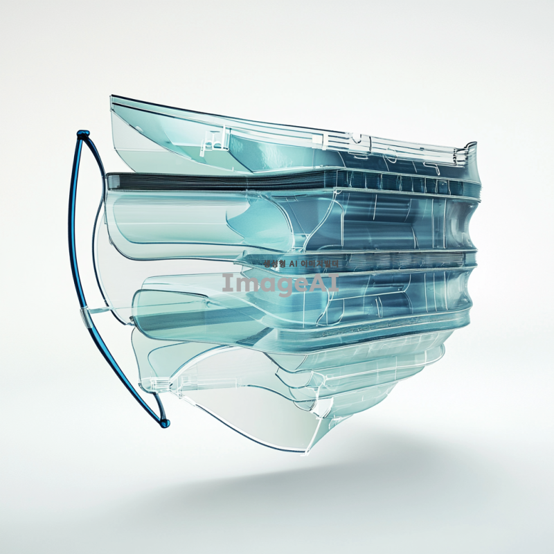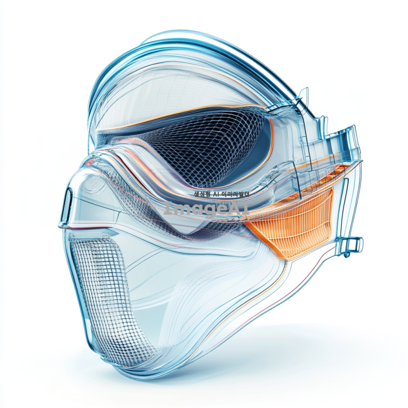 방진마스크 내부 단면도, 고해상도, 디테일 강조, 마스크의 여러 층과 필터 구조가 명확하게 보이도록, 각 층의 재질과 기능이 잘 드러나게, 현대적이고 기술적인 느낌, 과학적인 정보 그래픽 스타일, 깔끔하고 정돈된 이미지, 흰색 배경, 마스크의 측면에서 본 단면도, 필터의 다양한 층과 그 사이의 공기 흐름이 시각적으로 표현된 모습.
