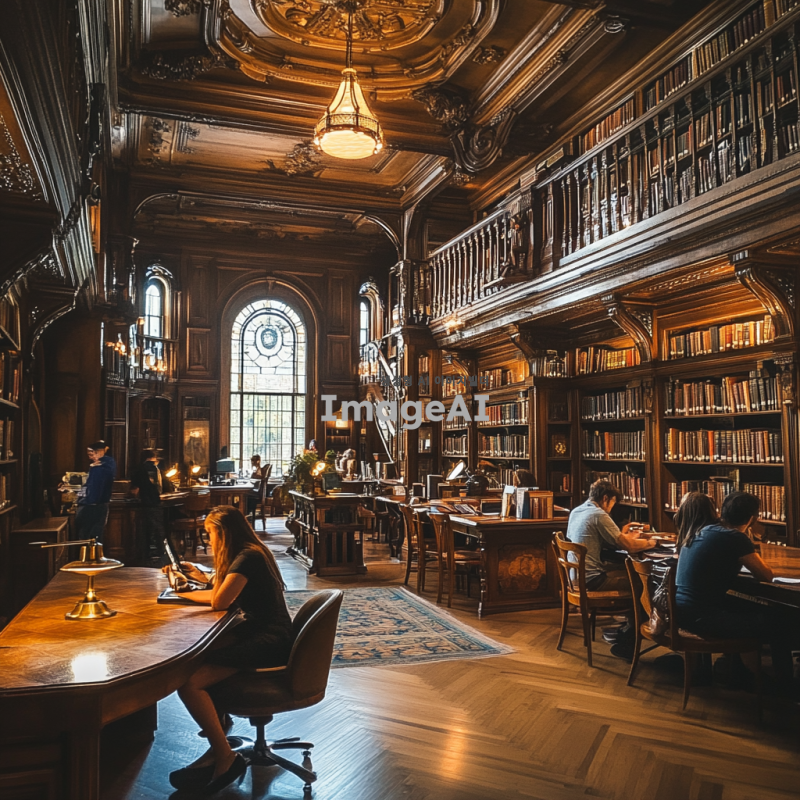 고풍스러운 도서관 내부, 높은 천장과 웅장한 나무 책장, 고전적인 디자인의 책상과 의자, 따뜻한 조명 아래에서 책을 읽는 사람들, 곳곳에 빈티지한 장식품과 오래된 책들이 가득한 모습, 창문을 통해 들어오는 자연광이 고풍스러운 분위기를 더함, 조용하고 평화로운 분위기.