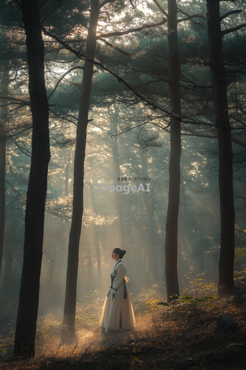 신비로운 숲속의 소나무가 사람처럼 의인화되어 서 있는 장면. 한국의 전통적인 복식이 현대적으로 재해석된 옷을 입고있다. 나무들은 곧고 우아하게 뻗어 있으며, 주변에는 안개가 살짝 깔려 있어 신비로운 분위기를 더하며, 부드러운 햇살이 나무 사이로 스며들어 따뜻한 느낌을 줌. 전체적으로 한국 전통 미술에서 영감을 받은 색감과 구도를 사용하여 자연의 경이로움을 강조함.
