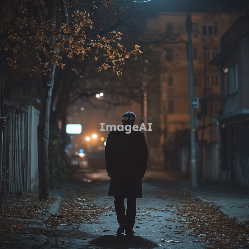 어두운 저녁, 거리의 희미한 가로등 불빛 아래 한 남자가 경찰서로 걸어가는 뒷모습. 남자는 어두운 색의 코트를 입고 있으며, 주변은 정적이 감도는 무거운 분위기. 길가에는 낙엽이 흩어져 있고, 멀리 경찰서의 불빛이 희미하게 보인다. 남자의 발걸음은 느리고 신중해 보이며, 주변의 건물들은 그림자 속에 가려져 있다.
