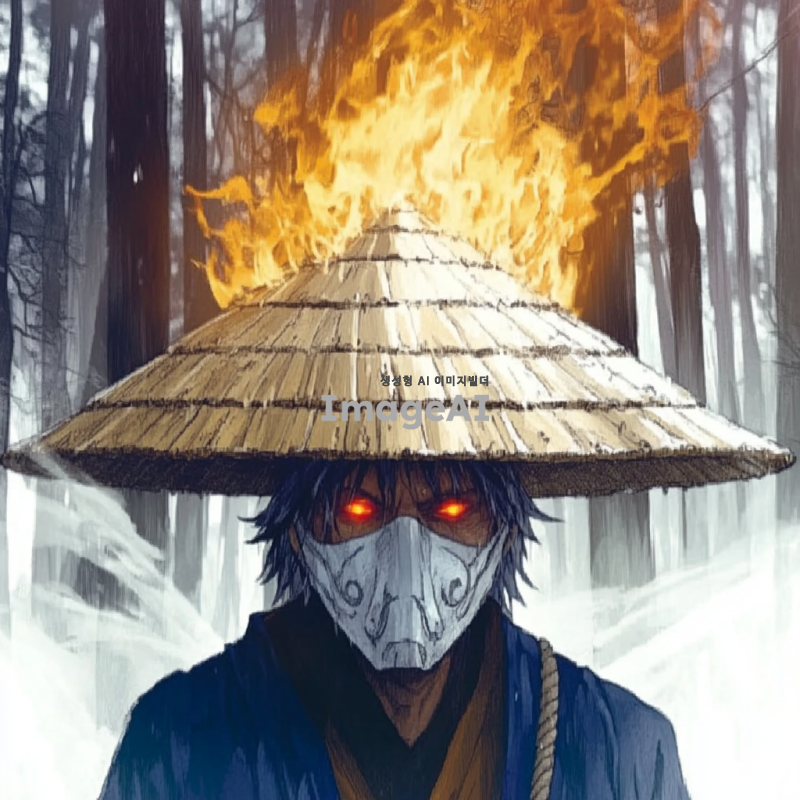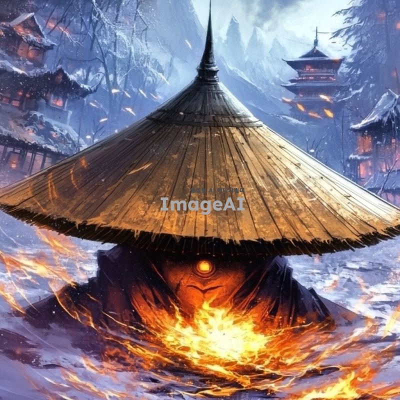 삿갓을 쓴 얼굴이 보이지 않는 남자가 불을 다루고 있는 장면, 주변은 차가운 기운이 감도는 겨울 풍경, 얼음과 눈이 쌓인 배경, 남자의 손에서 불꽃이 피어오르고 있으며, 불꽃은 따뜻한 색조로 빛나고 주변의 차가운 색조와 대조를 이루고 있음, 삿갓은 전통적인 디자인으로 묘사, 남자의 의상은 어두운 색조로, 불빛에 의해 부분적으로 강조된 모습, 한쪽눈이 붉게 빛나고 있다