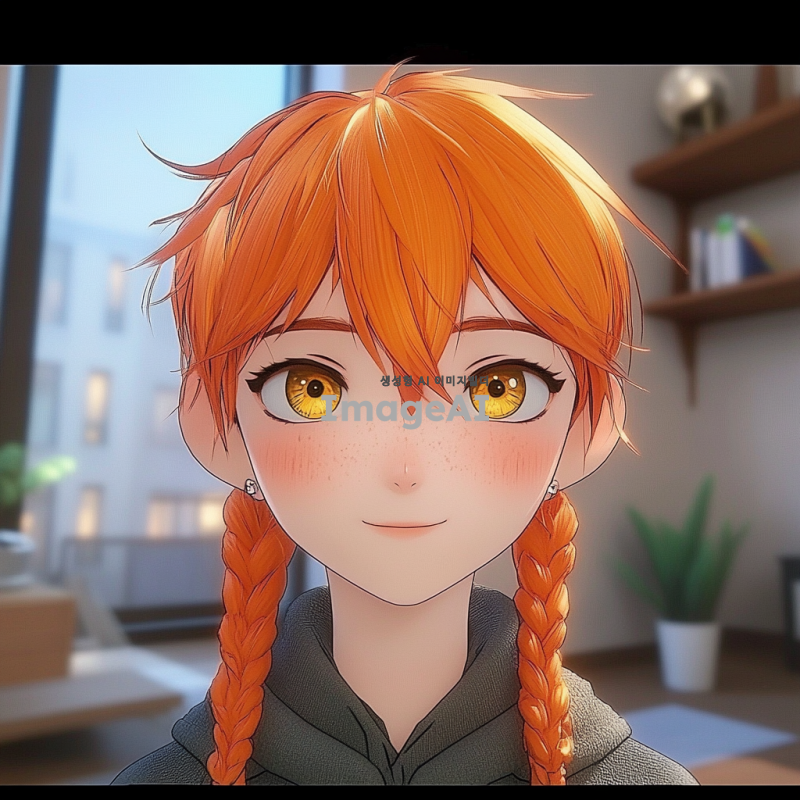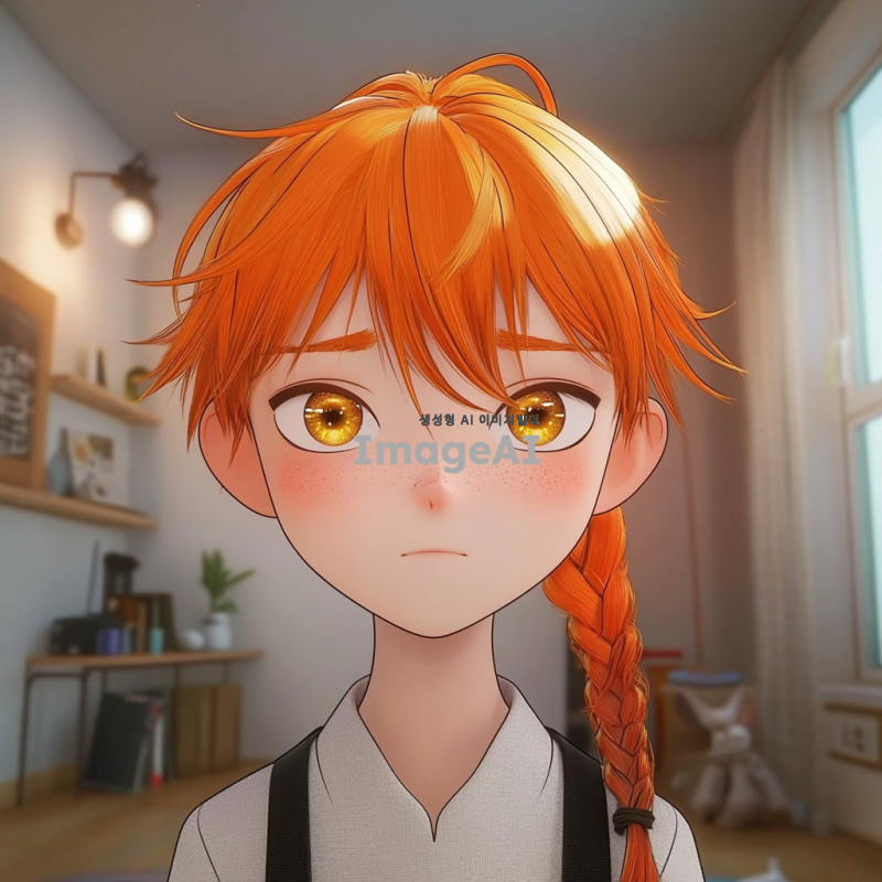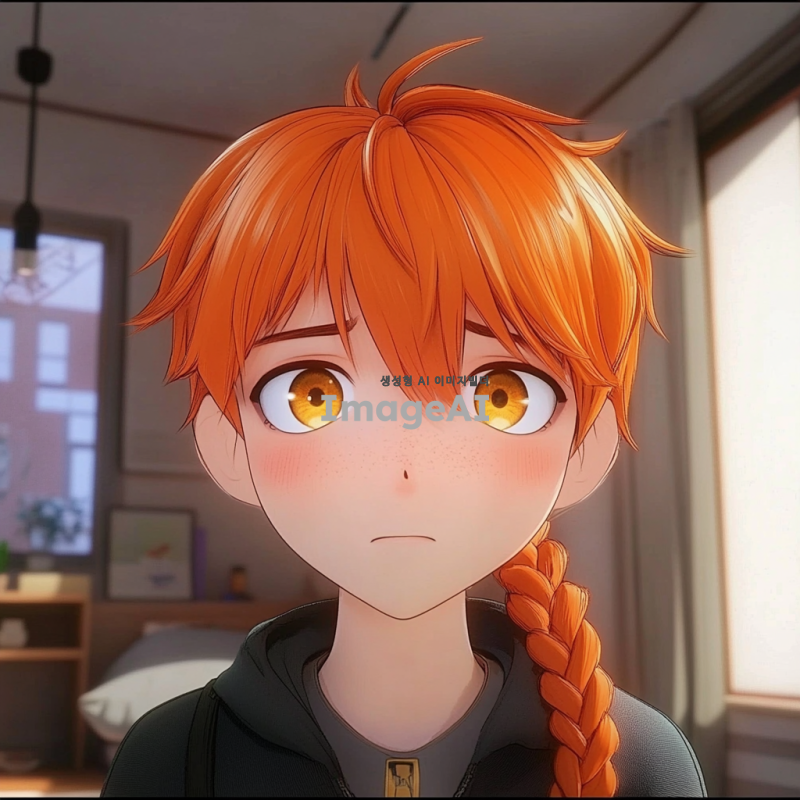 주황색 머리와 황금색 눈을 가진 귀여운 애니메이션 소년, 머리 한쪽에 긴 땋은 머리를 하고 있으며, 배경은 아파트입니다. 아름다움을 믿을 수 없을 정도로, 세밀한 얼굴 특징을 가진, K-24 애니메이션 스타일입니다.