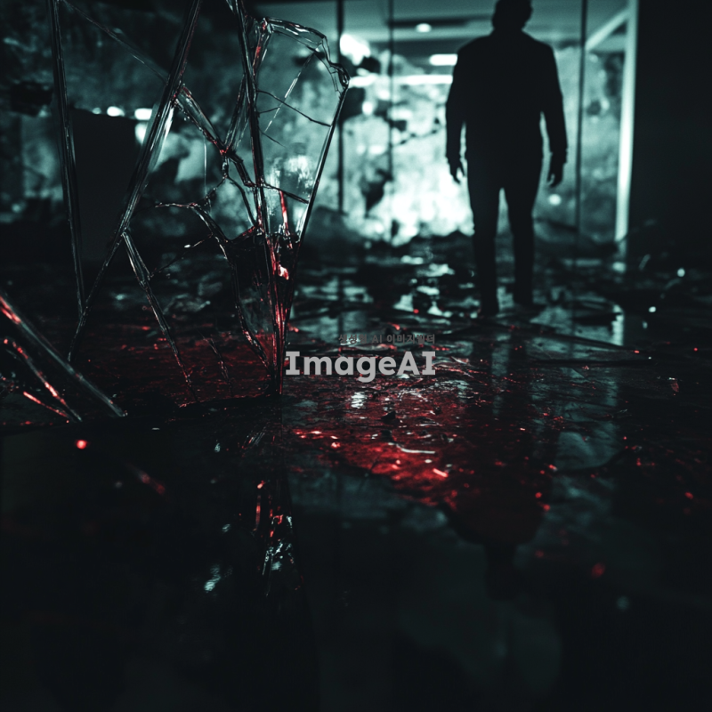 어두운 방 안, 바닥에 흩어진 깨진 유리조각들, 유리조각에 반사된 남자의 겁에 질린 표정, 유리조각에 묻은 검붉은 액체, 어둡고 공포스러운 분위기, 섬뜩한 조명과 그림자 효과