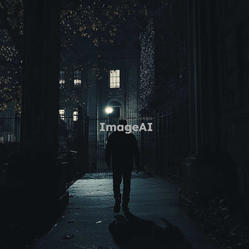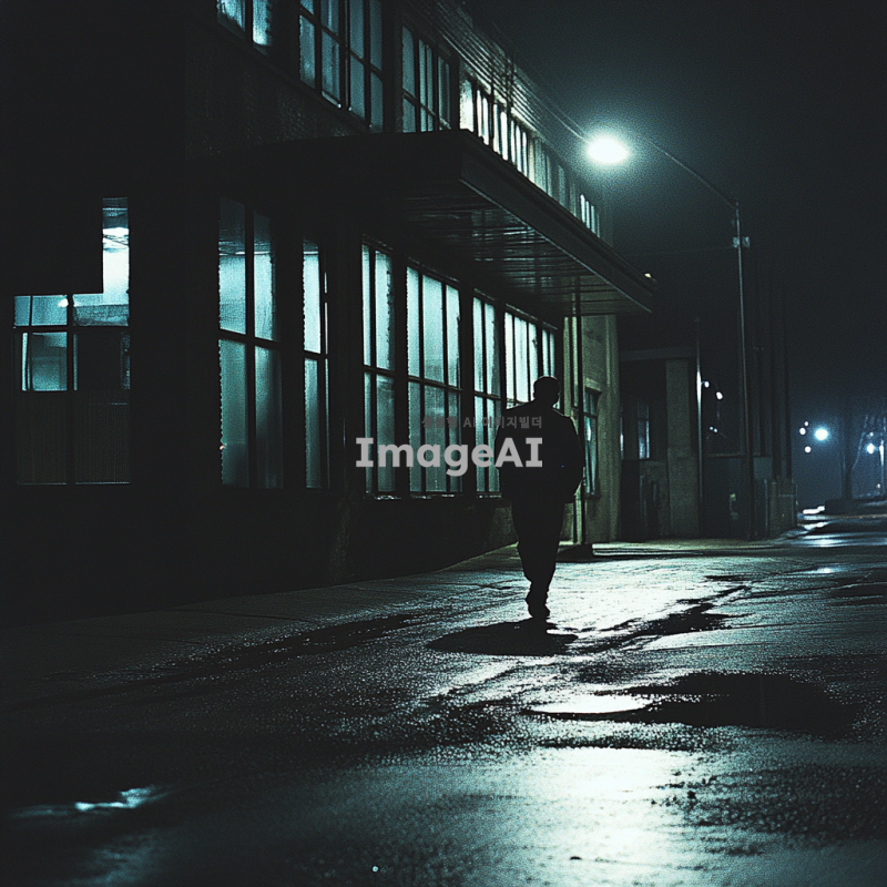 어두운 밤, 남자가 향하는 방향에는 큰 경찰서가 보인다. 남자의 옷은 어두운 색깔로, 검은 옷을 입고있다. 그의 발걸음은 결단력 있어 보이며, 서두르는것처럼 보인다