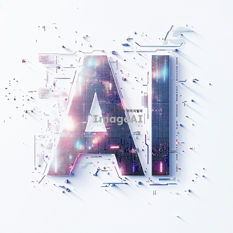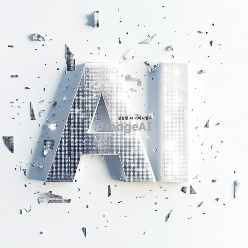 배경은 밝고 깨끗한 느낌의 하얀색, 중앙에 AI라는 단어가 크게 적힌 이미지. 글씨체는 미래적인 느낌의 세련되고 모던한 서체, 글씨 색상은 메탈릭 실버로 빛나는 효과. 주변에는 작은 데이터 코드 조각들이 흩어져 있는 모습, 전체적으로 기술적이고 현대적인 분위기.
