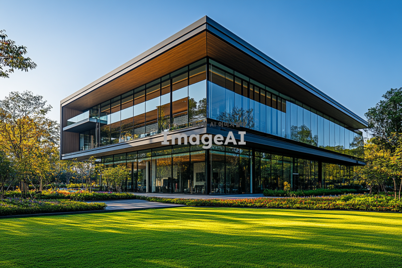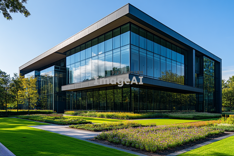 4층짜리 현대적인 건물이 잔디 정원에 둘러싸여 있는 모습. 건물은 유리와 금속 소재로 이루어져 있으며, 넓은 창문이 특징적이다. 정원은 깔끔하게 정돈되어 있고, 곳곳에 작은 나무와 꽃들이 심어져 있다. 건물의 외관은 세련되고 현대적인 디자인을 강조하며, 주변 환경과 조화를 이루고 있다. 하늘은 맑고 푸른색이며, 햇빛이 건물과 정원에 부드럽게 비추고 있다.