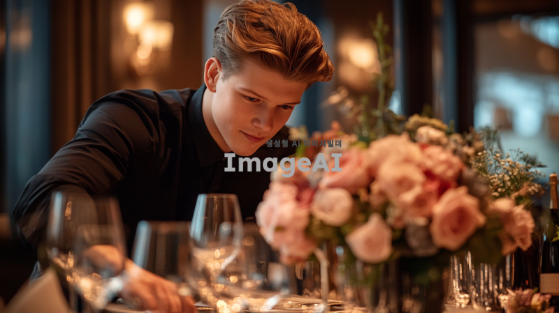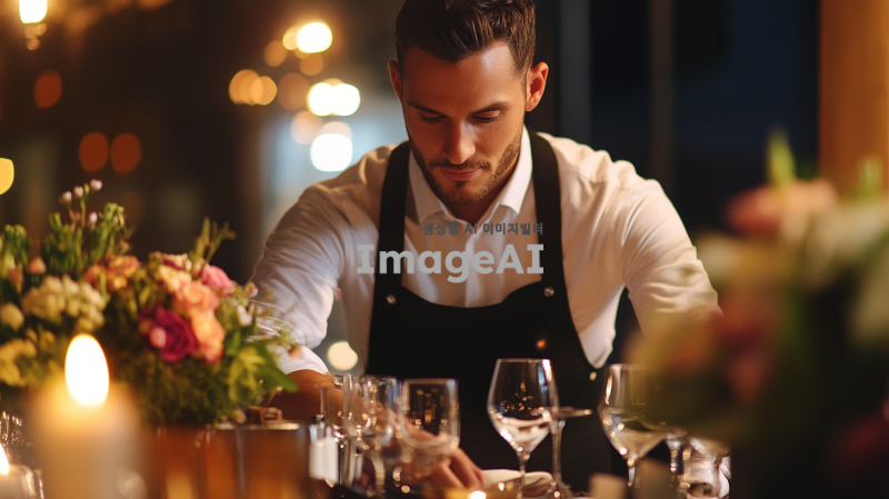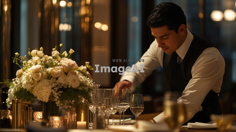 • 설명: 호텔리어가 결혼기념일 테이블을 정성스럽게 세팅하는 모습. 테이블에는 꽃, 와인잔, 촛불 등이 놓여 있음.